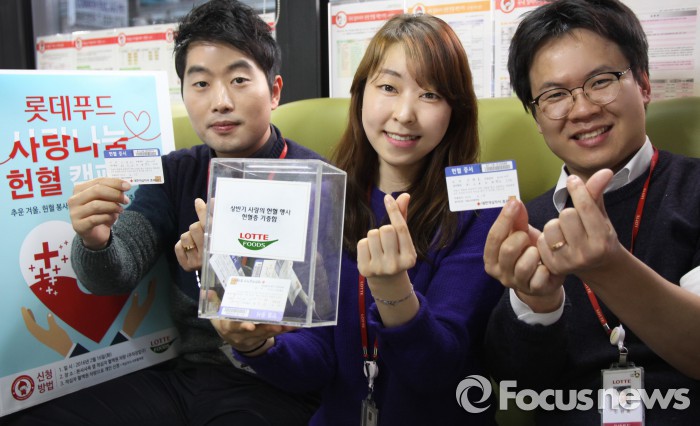 (서울=포커스뉴스) 롯데푸드의 임직원들은 지난 16일 영등포구 양평동 롯데푸드 본사 앞에서 사랑의 헌혈행사에 참여하고, 헌혈증을 기부했다.