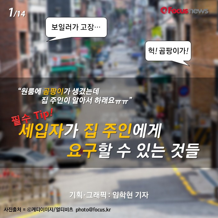 (서울=포커스뉴스) 본격적인 이사철이 다가오고 있습니다. 주택임대차계약 상 '을'인 세입자들은 방 한 칸 구하는 것도 쉬운 일이 아닌데요. 세입자로 살다 보면 마주치게 될 지 모르는 곰팡이·누수·층간소음 등의 문제, 어떻게 해결해야 할까요? 카드뉴스로 임차인이 임대인에게 요구할 수 있는 것들은 무엇이 있는 지 확인해 보세요.