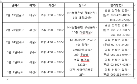 이번 설명회는 부동산, 신규 금융정책 대응방안 및 해외투자에 대한 내용이 포함됐다. 오는 19일 대구를 시작으로 부산(2월 23일), 서울(2월 24일, 3월 3일), 광주(3월 2일), 대전(3월 4일) 등 주요도시에서 열린다. ‘부동산, 신규 금융정책 대응방안 및 해외투자’에 대한 종합적인 내용으로 구성된다.