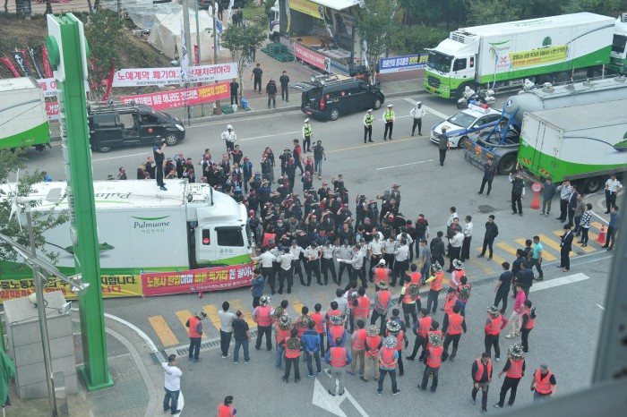또 △저속 운행, 출입구 점유 등으로 통행방해 △난폭운전을 하거나 안전운행에 지장을 주는 행위 △차량 등에 계란, 돌, 금속류 등 이물질 투척행위 △차량 등의 외부도색·유리창 파손 행위 △차량 등의 호스·구동부·타이어 등 차량 장치 파손 등도 금지행위에 포함된다.