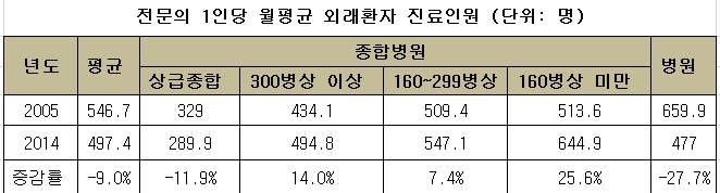상급종합병원 의사의 1인당 월평균 진료인원은 2005년 329명에서 2014년 289.9명으로 14.0% 감소했다. 반면 160병상 미만 종합병원은 2004년 513.6명에서 2014년 644.9명으로 25.6% 증가했다.