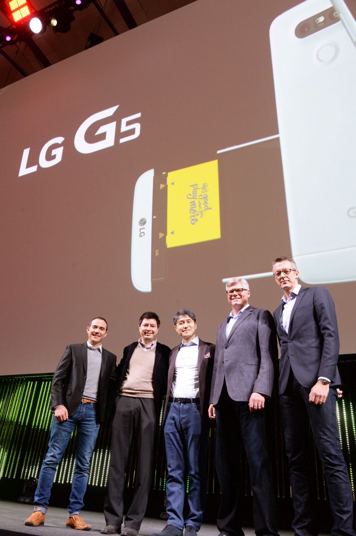 그가 말한 "LG전자는 스마트폰 스크린 속에 갇힌 본질적인 즐거움을 소비자에게 돌려줌으로써 LG 모바일만의 팬덤 문화를 만들어 가겠다"는 다짐이 관객들의 관심으로 입증된 것이다.조준호 LG전자 MC사업본부장 사장(가운데)이 왼쪽부터 스테판 페르손 뱅앤올룹슨(B&O) COO, 스티브 몰렌코프 퀄컴 CEO, 찰스 암스트롱 구글 스트리트뷰 총괄 매니저, 니콜라스 해프터메이어 패럿 CMO와 기념촬영을 하고 있다.