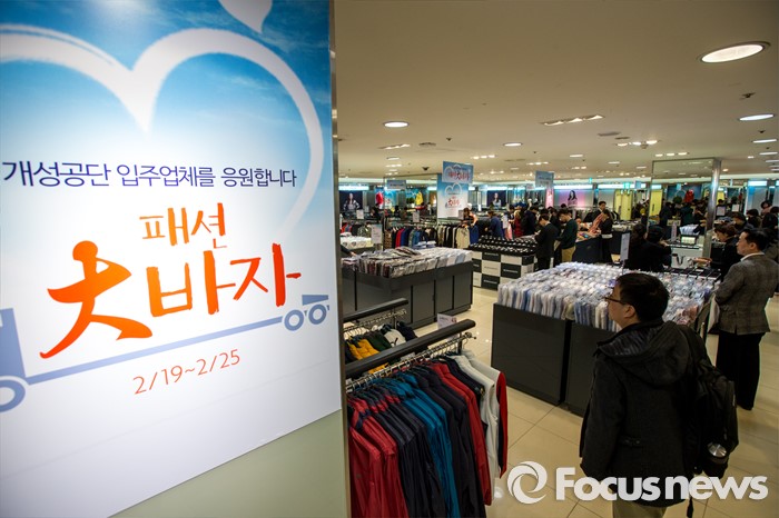 산업부와 한국산업단지공단은 입주기업들의 대체공장을 밀착 지원하기 위해 이날 ‘산단공 개성공단 입주기업 지원 TF’(연락처 : 070-8895-7359)를 발족했다.(서울=포커스뉴스) 북한 장거리 미사일 발사 이후 개성공단 운영 중단이 이어지고 있는 19일 오전 서울 중구 롯데백화점 본점에서 열린 '개성공단 패션 대바자'를 찾은 고객들이 물품을 보고 있다.이번 행사는 피해가 발생할 것으로 예상되는 개성공단 입점 14개 협력사의 30여 개 브랜드를 모아 롯데백화점 본점과 영등포점에서 25일까지, 잠실점에서는 21일까지 진행 될 예정이며, 의류와 신발, 액세서리 등 총 80억 원 상당의 상품을 선보일 예정이다. 2016.02.19 강진형 기자