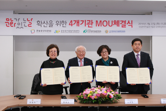 융성위와 보육 및 유아교육시설 단체 3곳은 지난해부터 매월 마지막주 수요일 '문화가 있는 날'에 어린이집, 유치원 등으로 문화예술단체가 직접 찾아가는 '동(洞)!동(童)!동(動)! 문화놀이터' 사업을 공동으로 시행해 왔다. 올해는 400개소에서 다양한 문화예술행사가 펼쳐질 예정이다.문화융성위원회와 중앙육아종합지원센터, 한국어린이집총연합회, 한국유치원총연합회는 23일 서울 현대미술관 서울관 국제화상회의실에서 '문화가 있는 날' 확산을 위한 업무협약(MOU) 체결식을 열었다. 사진 왼쪽부터 이경자 한국유치원총연합회 이사장, 표재순 문화융성위원회 위원장, 마미정 중앙육아종합지원센터 센터장, 정광진 한국어린이집총연합회 회장.<사진제공=문화융성위원회>