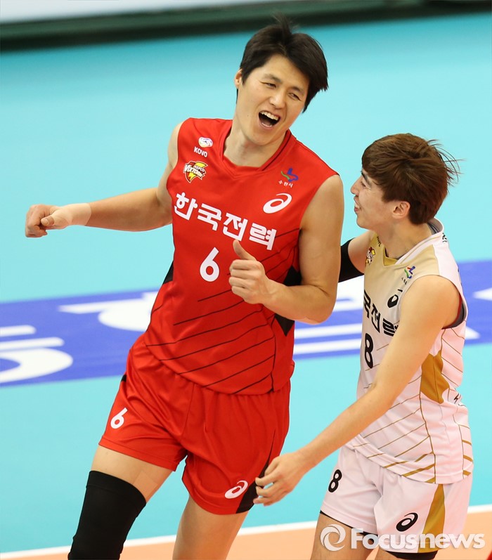 (수원=포커스뉴스) 23일 수원실내체육관에서 열린 '2015-2016NH농협 V-리그' 남자부 한국전력-삼성화재 경기에서 한국전력 방신봉이 블로킹 득점을 올리고 리베로 오재성과 함께 기뻐하고 있다.