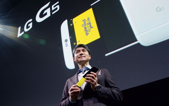 실제 G5는 세계 최초의 모듈 방식 스마트폰으로 착탈식 배터리의 유용성과 풀 메탈 디자인의 심미성을 동시에 구현했다. 또한 스마트폰 최초로 135도 광각 카메라를 탑재해 이전에 없던 새로운 비쥬얼 경험을 전달하고, ‘올웨이즈온’ 디스플레이를 적용해 사용자 편의성을 크게 향상 시켰다는 평가를 받고 있다.조준호 LG전자 MC부문 사장이 신제품 G5를 소개하고 있다.<사진제공=LG전자> 2016.02.21 왕해나 기자 ]
