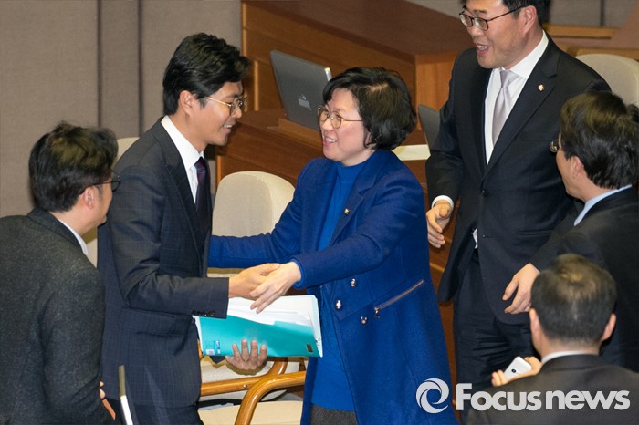 (서울=포커스뉴스) 김광진 더불어민주당 의원이 24일 오전 서울 여의도 국회 본회의에서 테러방지법과 관련해, 무제한 토론을 마친 뒤, 동료의원들의 격려를 받고 있다.