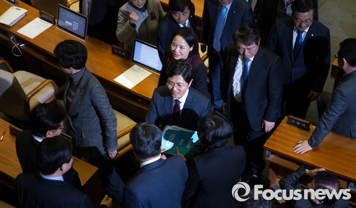 (서울=포커스뉴스) 김광진 더불어민주당 의원이 24일 오전 서울 여의도 국회 본회의에서 테러방지법과 관련해, 5시간 33분간 이어진 무제한 토론을 마친 뒤, 동료 의원들의 격려를 받으며 퇴장하고 있다.