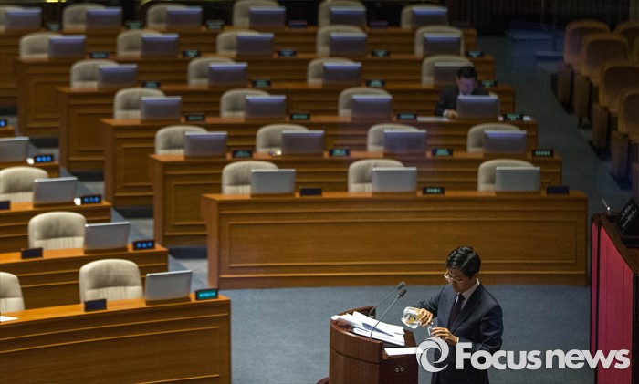 (서울=포커스뉴스) 김광진 더불어민주당 의원이 24일 오전 서울 여의도 국회 본의회에서 테러방지법과 관련해 무제한토론을 하는 중에 물을 따르고 있다.