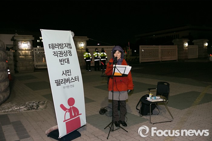 (서울=포커스뉴스) 한 시민이 24일 오전 서울 여의도 국회 정문 앞에서 테러방지법 처리를 반대하는 시민 필리버스터에 참여해 연설을 하고 있다.