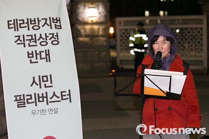 (서울=포커스뉴스) 한 시민이 24일 오전 서울 여의도 국회 정문 앞에서 테러방지법 처리를 반대하는 시민 필리버스터에 참여해 연설을 하고 있다.