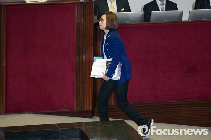 (서울=포커스뉴스) 은수미 더불어민주당 의원이 24일 오전 서울 여의도 국회 본회의장에서 테러방지법과 관련한, 무제한 토론을 하기 위해 단상에 오르고 있다.