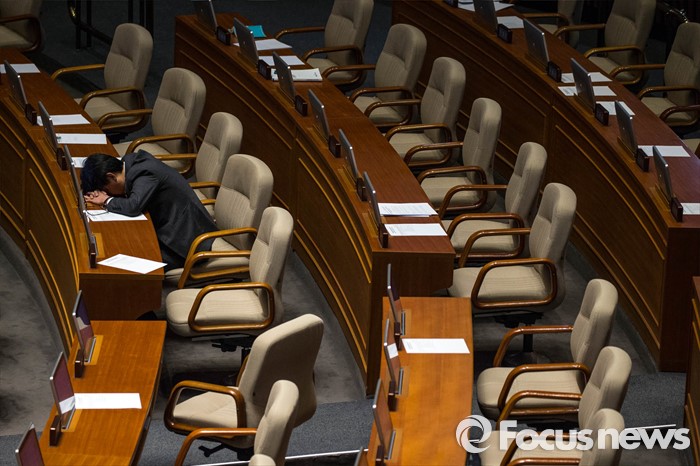 (서울=포커스뉴스) 테러방지법 처리 저지를 위한 야당의 릴레이 필리버스터가 진행중인 24일 오전 진성준 더불어민주당 의원이 서울 여의도 국회 본회의장에서 쪽잠을 자고 있다.