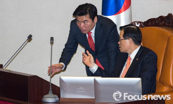 (서울=포커스뉴스) 23일 오후 서울 여의도 국회 본회의장에서 테러방지법 처리를 막기 위한 야당의 '필리버스터'가 시작된 후 원유철 새누리당 원내대표가 정의화 국회의장과 대화를 나누고 있다.