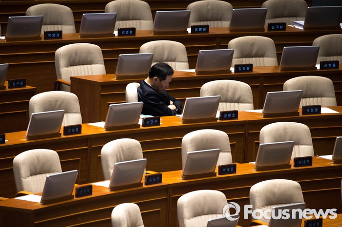 (서울=포커스뉴스) 테러방지법 처리 저지를 위한 야당의 릴레이 필리버스터가 진행중인 24일 오전 문병호 국민의당 의원이 서울 여의도 국회 본회의장에서 쪽잠을 자고 있다.