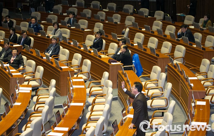 (서울=포커스뉴스) 홍철호(앞) 새누리당 의원이 24일 오전 서울 여의도 국회 본회의장에서 테러방지법과 관련해, 은수미 더불어민주당 의원의 무제한 토론 내용에 대해 이의를 제기하고 있다.