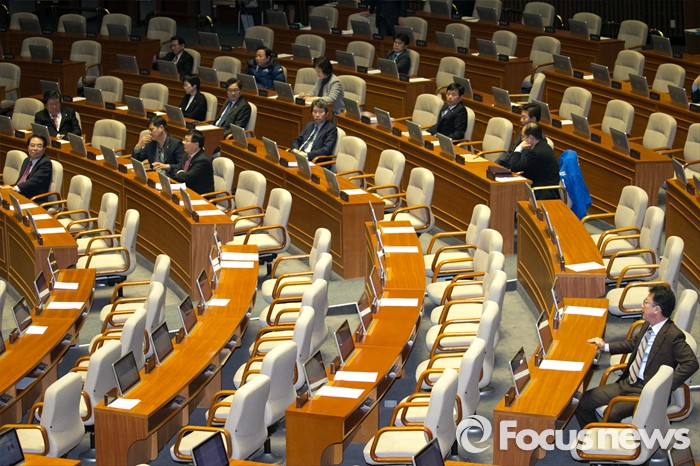 (서울=포커스뉴스) 홍철호(앞 오른쪽) 새누리당 의원이 24일 오전 서울 여의도 국회 본회의장에서 테러방지법과 관련해, 은수미 더불어민주당 의원의 무제한 토론 내용에 대해 이의를 제기하고 있다.