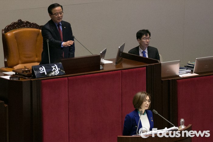 (서울=포커스뉴스) 은수미(앞) 더불어민주당 의원이 24일 오전 서울 여의도 국회 본회의장에서 테러방지법과 관련해, 무제한 토론을 하는 동안, 정갑윤(뒷줄 왼쪽) 부의장이 연설 주제에 대해 지적하고 있다.