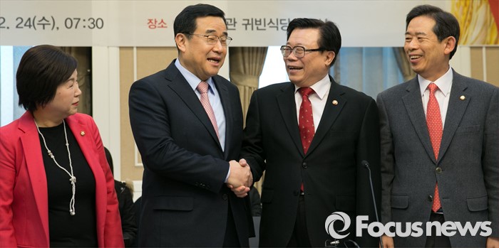 (서울=포커스뉴스) 24일 오전 서울 여의도 국회 귀빈식당에서 열린 쌀 수급 안정을 위한 당정협의에 앞서 새누리당 의원들과 정부부처 참석자들이 취재진을 향해 포즈를 취하고 있다. 왼쪽부터 윤명희 의원, 김정훈 정책위의장, 이동필 농림축산식품부 장관, 안효대 의원.