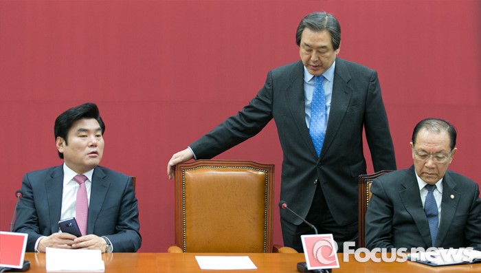 (서울=포커스뉴스) 故 이기택 전 민주당 총재 국회 영결식에 다녀온 김무성 새누리당 대표가 24일 오전 서울 여의도 국회에서 열린 최고중진연석회의에 재참석하고 있다. 왼쪽부터 원유철 원내대표, 김 대표, 황우여 의원.