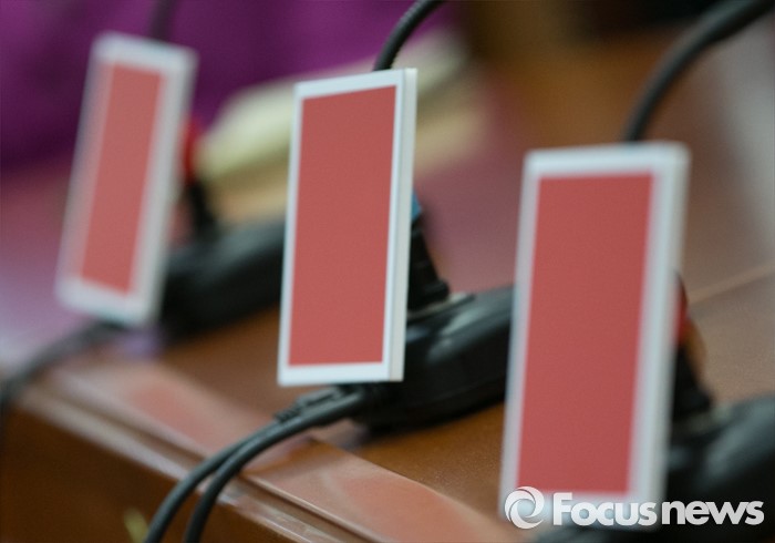 (서울=포커스뉴스) 24일 오전 서울 여의도 국회에서 열린 새누리당 최고중진연석회의에 자리한 의원들의 마이크에 메세지가 없는 빨간 피켓이 걸려 있다.