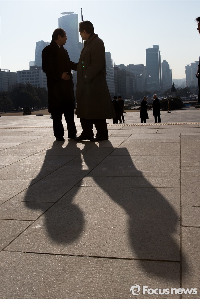 (서울=포커스뉴스) 24일 오전 서울 여의도 국회의사당 본청 앞에서 김무성 새누리당 대표가 故 이기택 전 민주당 총재의 4.19 민주사회장 영결식 참석 후 신경식 대한민국헌정회 회장과 대화하고 있다.