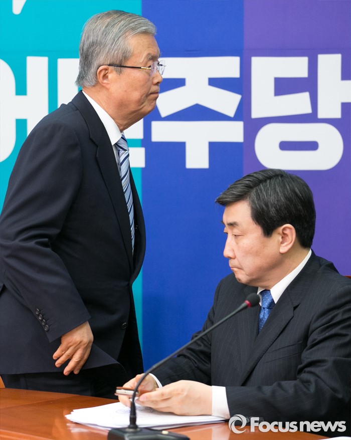(서울=포커스뉴스) 김종인 더불어민주당 비대위 대표가 24일 오전 서울 여의도 국회에서 비상대책위원회의를 마친 뒤 퇴장하고 있다. 오른쪽은 이종걸 원내대표.