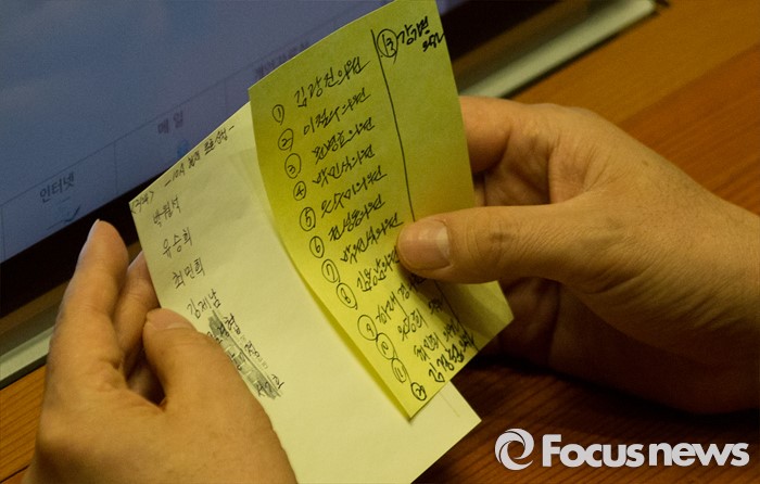(서울=포커스뉴스) 24일 오전 서울 여의도 국회에서 원유철 새누리당 원내대표가 은수미 더불어민주당 의원이 테러방지법 관련해 무제한 토론을 지켜보며 다음 필리버스터 의원들 명단을 살펴보고 있다.
