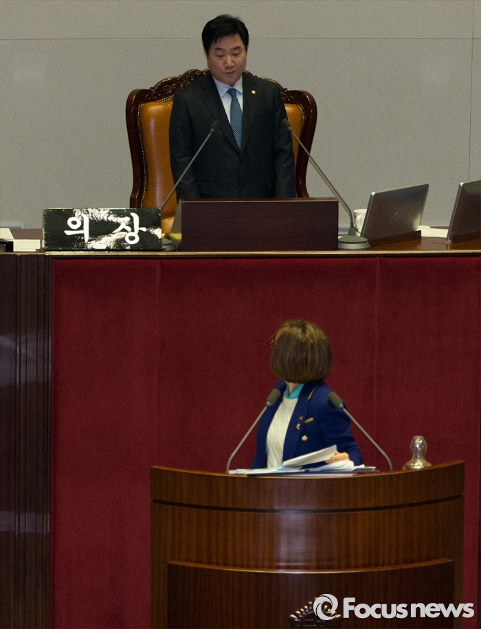 (서울=포커스뉴스) 24일 오전 서울 여의도 국회에서 은수미 더불어민주당 의원이 테러방지법과 관련해 무제한 토론을 이어가던 중 의장석을 교대하는 이석현 국회부의장을 바라보고 있다.