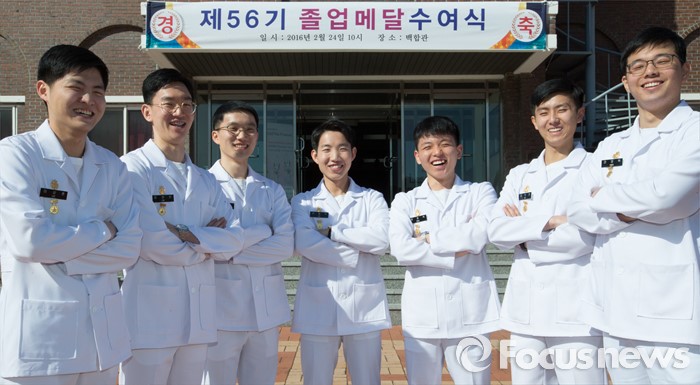 (대전=포커스뉴스) 24일 오전 대전 유성구 국군간호사관학교 백합관에서 열린 졸업매달 수여식을 마치고 제56기 남자생도들이 포즈를 취하고 있다. 56기 남자생도는 국군간호사관학교 1951년 개교 이후 61년 만에 처음으로 입소해 4년간의 교육과정을 마치고 졸업하게 됐다. 왼쪽부터 권재혁, 이우진, 방윤혁, 이윤각, 이승주, 임채원, 이상훈.
