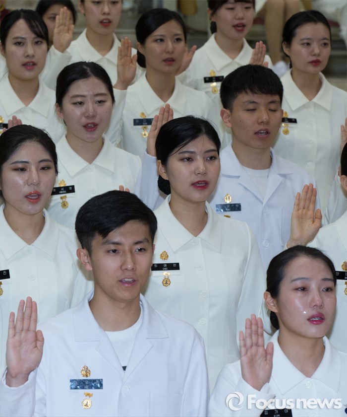 (대전=포커스뉴스) 24일 오전 대전 유성구 국군간호사관학교 백합관에서 열린 졸업매달 수여식에서 졸업식을 앞둔 제56기 생도들이 나이팅게일 선서를 하고 있다.