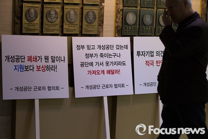 (서울=포커스뉴스) 24일 오전 서울 여의도 중소기업중앙회에서 열린 개성공단 기업 비상대책위원회 총회에서 피켓 앞으로 입주기업 관계자들이 지나가고 있다.
