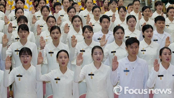 (대전=포커스뉴스) 24일 오전 대전 유성구 국군간호사관학교 백합관에서 열린 졸업매달 수여식에서 졸업식을 앞둔 제56기 생도들이 나이팅게일 선서를 하고 있다.