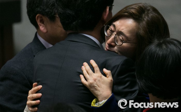 (서울=포커스뉴스) 테러방지법 직권상정에 반발해 야당의 무제한 토론(필리버스터)이 진행되고 있는 24일 오후 서울 여의도 국회 본회의장에서 토론을 마친 은수미 더불어민주당 의원이 동료 의원들의 격려를 받고 있다.