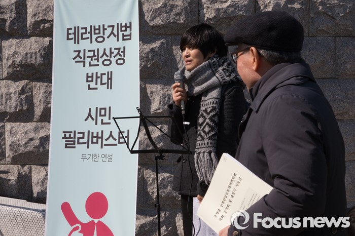 (서울=포커스뉴스) 24일 오후 서울 여의도 국회 정문 앞에서 테러방지법 처리를 반대하는 시민이 필리버스터에 참여해 연설을 하고 있다.