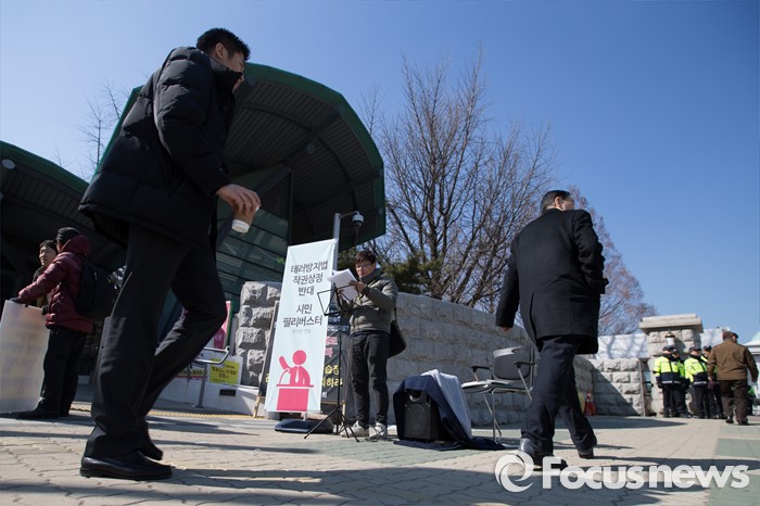 (서울=포커스뉴스) 24일 오후 서울 여의도 국회 정문 앞에서 테러방지법 처리를 반대하는 시민이 필리버스터에 참여해 연설을 하는 가운데 주위로 시민들이 지나가고 있다.