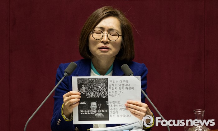 (서울=포커스뉴스) 테러방지법 직권상정에 반발해 야당의 무제한 토론(필리버스터)이 진행되고 있는 24일 오후 서울 여의도 국회 본회의장에서 토론에 참여한 은수미 더불어민주당 의원이 발언 중, 고 김대중 전 대통령에 대한 얘기를 하고 있다. 은 의원은 이날 10시간 18분의 토론을 기록해 국내 최장기록인 10시간 15분을 경신했다.