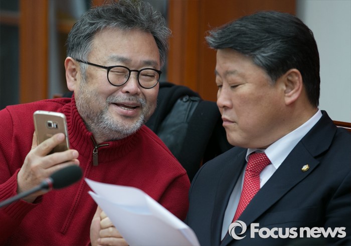 | △ 핸드폰 보며 대화하는 조원진-조동원 |