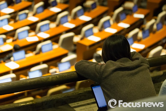 (서울=포커스뉴스) 테러방지법 직권상정에 반발해 야당의 무제한 토론(필리버스터)이 진행되고 있는 24일 오후 서울 여의도 국회 본회의장에서 한 취재진이 박원석 정의당 의원의 발언을 지켜보고 있다.
