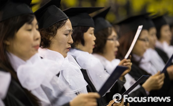 (서울=포커스뉴스) 24일 오후 서울 송파구 올림픽체조경기장에서 열린 '한국방송통신대학교 2015학년도 학위수여식'에 참석한 졸업생들이 교가를 부르고 있다.