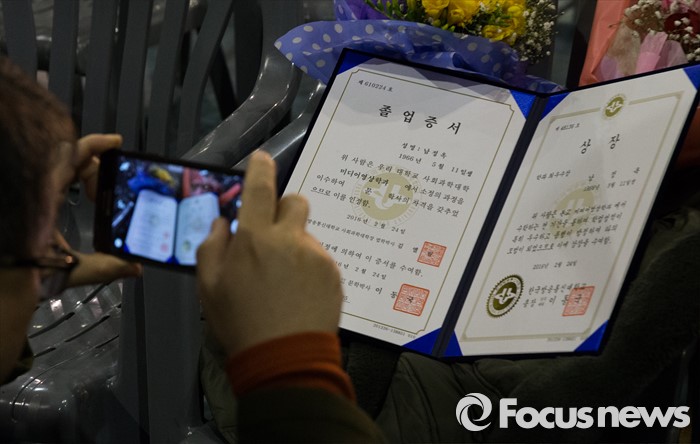 (서울=포커스뉴스) 24일 오후 서울 송파구 올림픽체조경기장에서 열린 '한국방송통신대학교 2015학년도 학위수여식'에 참석한 졸업생이 졸업증서를 찍고 있다.