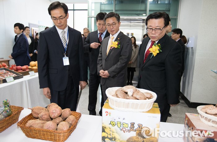 (안성=포커스뉴스) 24일 오후 경기 안성시 하나원에서 열린 하나원 농업·농촌 홍보관 개관식에서 이동필 농림축산식품부 장관과 홍용표 통일부 장관이 농촌 정착 북한 이탈주민들이 생산한 농산물을 둘러보고 있다.