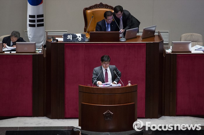 (서울=포커스뉴스) 박원석 정의당 의원이 24일 오후 서울 여의도 국회 본회의장에서 테러방지법의 본회의 의결을 막기 위한 필리버스터(무제한 토론을 통한 합법적 의사진행 방해)를 하고 있다.