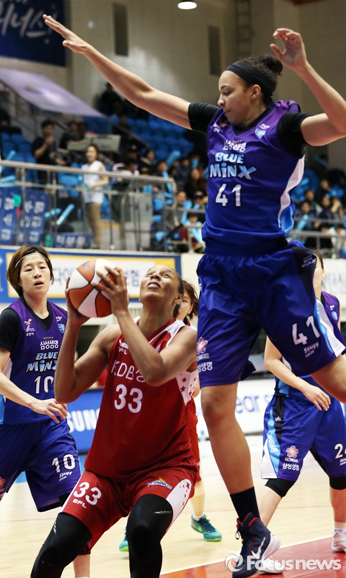 (구리=포커스뉴스) 24일 구리시체육관에서 열린 2015~2016 여자프로농구 KDB생명-삼성생명 경기에서 KDB생명 플레넷이 삼성생명 스톡스를 슈팅 모션으로 따돌리고 있다.