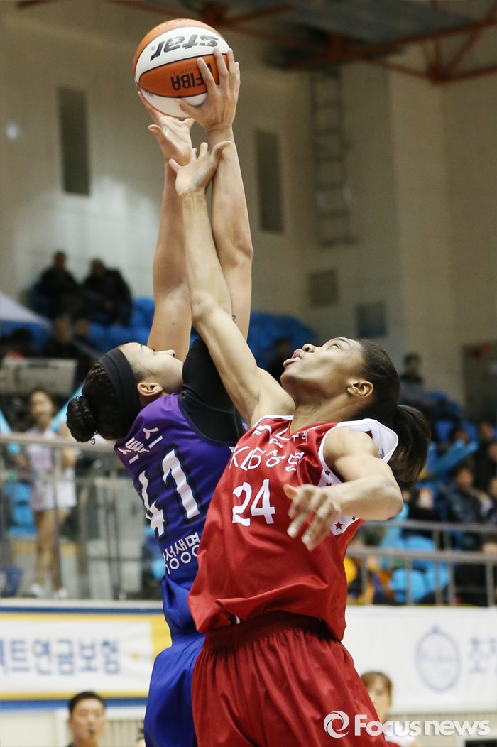 (구리=포커스뉴스) 24일 구리시체육관에서 열린 2015~2016 여자프로농구 KDB생명-삼성생명 경기에서 삼성생명 스톡스가 KDB생명 비키바흐를 제치며 리바운드볼을 잡고 있다.