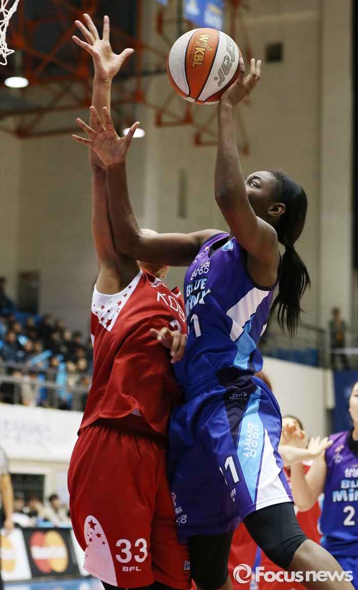 (구리=포커스뉴스) 24일 구리시체육관에서 열린 2015~2016 여자프로농구 KDB생명-삼성생명 경기에서 돌파를 시도하던 삼성생명 배혜윤을 KDB생명 김소담이 팔꿈치로 저지하고 있다.