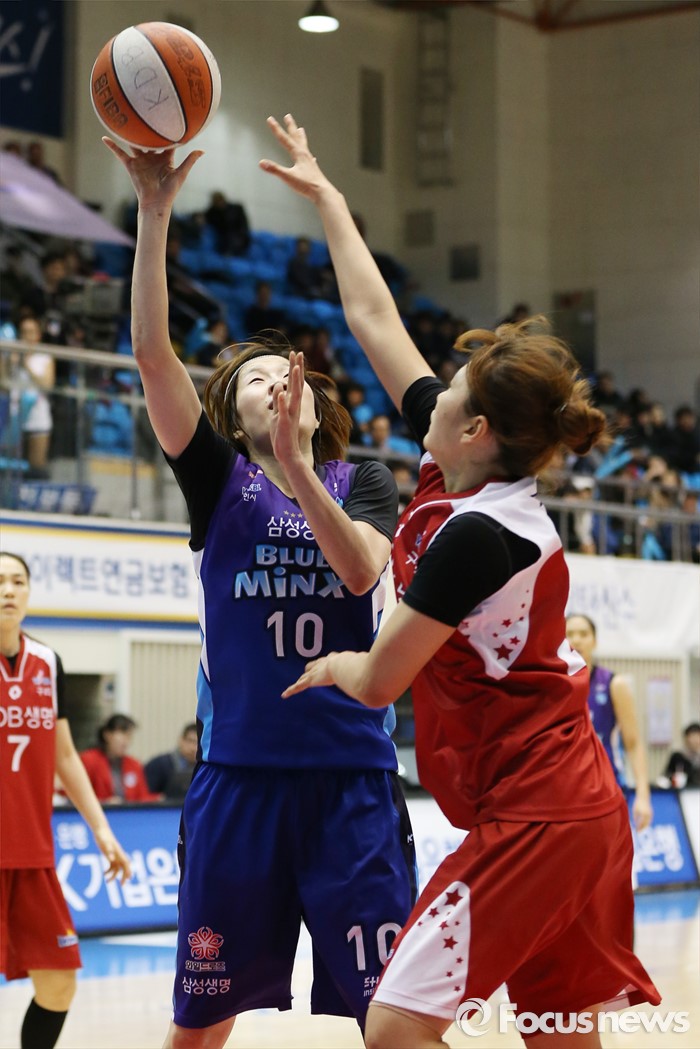 (구리=포커스뉴스) 24일 구리시체육관에서 열린 2015~2016 여자프로농구 KDB생명-삼성생명 경기에서 삼성생명 고아라가 KDB생명 구슬의 마크를 받으며 점프슛을 쏘고 있다.