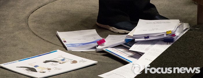 (서울=포커스뉴스) 테러방지법 직권상정에 반발해 야당의 무제한 토론(필리버스터)이 진행되고 있는 25일 새벽 서울 여의도 국회 본회의장에서 최민희 더불어민주당 의원이 발언을 하던중 자신이 준비한 자료들을 살펴보고 있다.