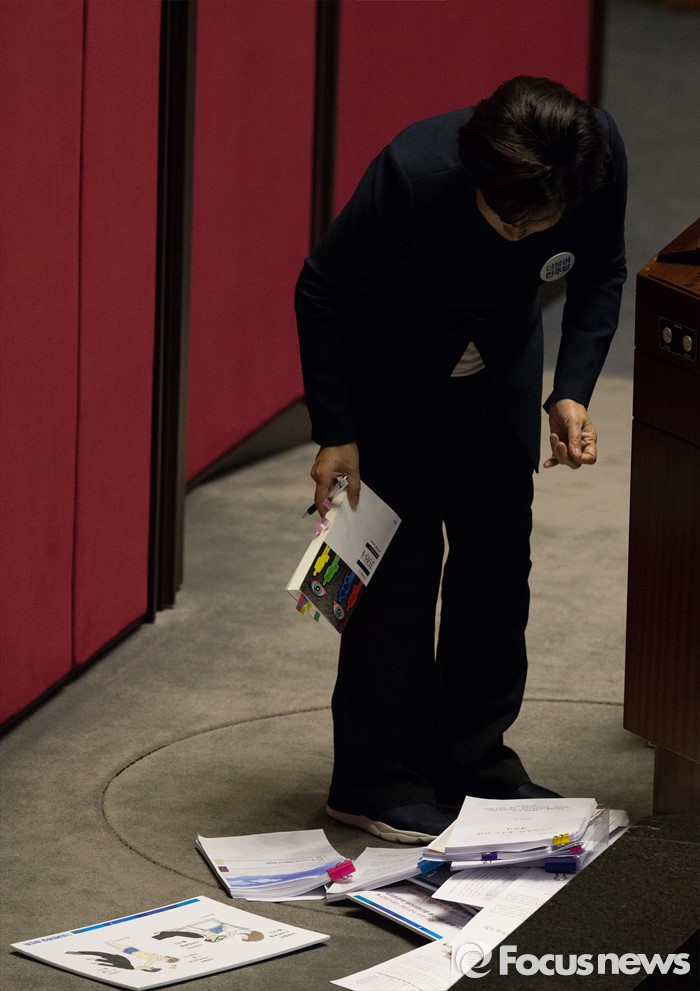 (서울=포커스뉴스) 테러방지법 직권상정에 반발해 야당의 무제한 토론(필리버스터)이 진행되고 있는 25일 새벽 서울 여의도 국회 본회의장에서 최민희 더불어민주당 의원이 발언을 하던중 자신이 준비한 자료들을 살펴보고 있다.