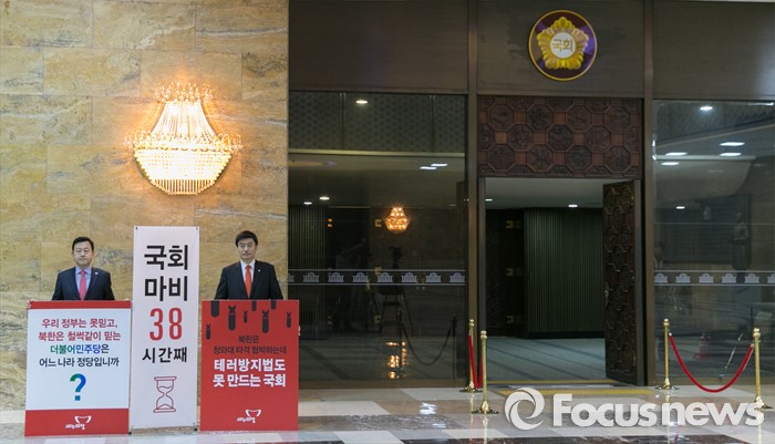 (서울=포커스뉴스) 테러방지법 직권상정에 반발해 야당의 무제한 토론(필리버스터)이 사흘째 진행되고 있는 25일 오전 서울 여의도 국회 본회의장 앞에서 김용남(왼쪽), 심윤조 새누리당 의원이 무제한 토론을 비판하는 시위를 하고 있다.